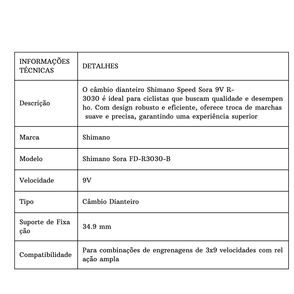 INFORMAÇÕES TÉCNICAS: O Câmbio Dianteiro Shimano Speed Sora 9V R-3030 é a escolha ideal para ciclistas que buscam qualidade e desempenho em suas pedaladas. Com um design robusto e eficiente, este câmbio oferece uma troca de marchas suave e precisa, garantindo uma experiência de ciclismo superior.